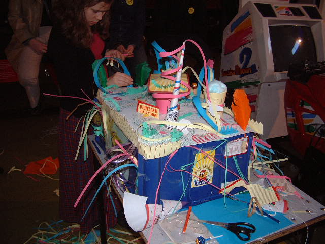 Kilpailun päätehtävänä oli rakentaa pienoismalli tulevaisuuden Linnanmäestä. Alla keltaisen joukkueen tyylinäyte.