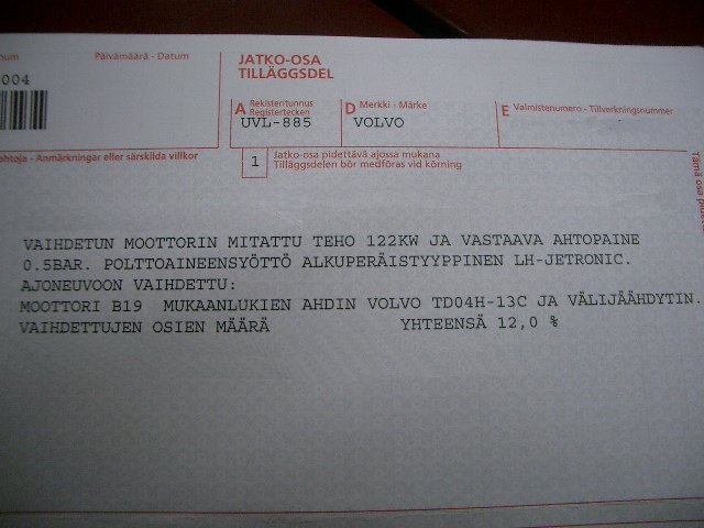 Noh, tästä ei häkellytty, Helsingissä kun riittää näitä katsastusasemia. Omia euroja ei laiteta senttiäkään mihinkään palvelunumeroihin, kun ne pitää saada tietoon suoraan katsastusasemaltakin. Seuraavaksi ajettiin Herttoniemen katsastusasemalle (nyt voi jo nimenkin mainita) ja mietittiin, että mitähän täällä tuumattaisiin Volvon ahdetusta muutoskatsastuksesta. Palvelu oli heti asiallista ja sangen asiantuntevaa. Prosessi aloitettiin samalla tavoin kyselemällä mitä tarvitaan em. muutoskatsastukseen. Kerrottiin heti, että tehotodistus ainakin ja lisäksi esim. vastaavan tehtaan Turbo-mallin moottorin todistus tehoista tai jokin muu lupalappu. Lisäksi tarvitaan katsastusaseman arkistoon todistus, mistä uusi turbo-versio on saatu, ettei ole ihan omassa pajassa sentään kyhätty. Viimeksi mainittu oli helppoa kun oli kopiot luovuttaja-auton rekisteriotteesta ja turbomaininnasta.