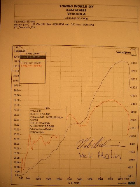 Tarkkoja siis ollaan tänä päivänä ja otteeseen tuli merkinnät tehosta, ruiskusta, ahtimesta, koneesta (b19), ahtopaineesta sekä muutosprosentit. Jotain hyvää sentään myöskin. Pienen vihjailun päätteeksi saatiin merkintä VÄLIJÄÄHDYTTIMESTÄ! Välijäähdytinhän rinnastetaan muutoskatsastuksen piiriin ja Volvo ei anna lausuntoa kyseisestä laitoksesta. Jos selailet vanhaa lisävarusteluetteloa 80-luvulta niin siellä lukee 240 välijäähdyttimestä, että "ei katukäyttöön". Nyt on turha enää selittää, että se olisi myöhemmin asennettu tähän autoon kun lukee mustaa valkoisella. Jotain harvinaisempaa saatiin sentään aikaiseksi ja maksimi teholuokkakin kehiin eli 220/275, JES!