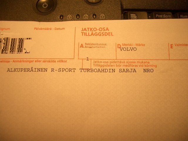 Lopuksi oli paperisodan vuoro ja sanamuotojen raapustaminen rekisteriotteeseen. Paljon tulee tekstiä nykyään verrattuna aikanaan kultaisella 80-luvulla tapahtuneisiin lausuntoihin. Vai mitä sanotte, jos rekisteriotteessa lukisi vain: "Alkuperäinen R-sport turboahdinsarja no: 1234567" tai pelkästään "Turboahdettu moottori". Nämähän mahdollistavat melkein mitä moottorin muutoksia tahansa, ilman sen kummempia muutoskatsastuksia.