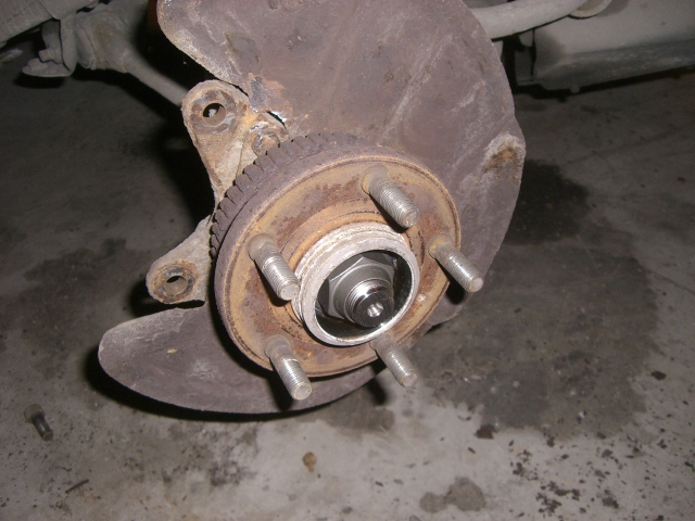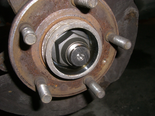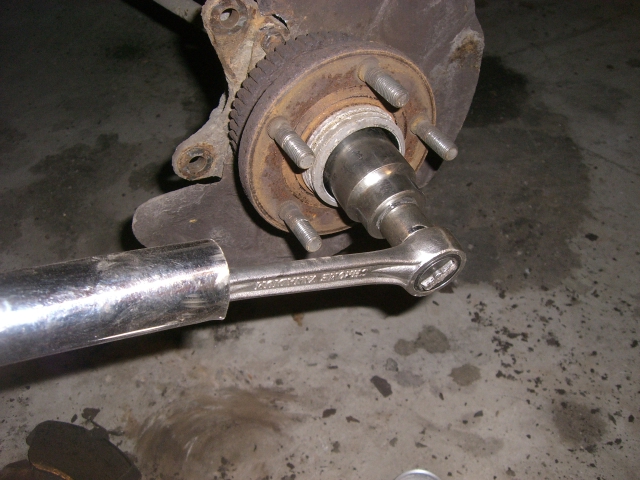 Laippa irtoaa poistamalla suojakuppi ja käätämällä pultti irti. Koko on muhkeat 36 mm (sama kuin B20 jakopään rattaissa, joten hylsy löytyi omasta takaa) ja kupissakin kerrottu 85 Nm kiristysmomentti, joten jatkovartta tarvitaan..