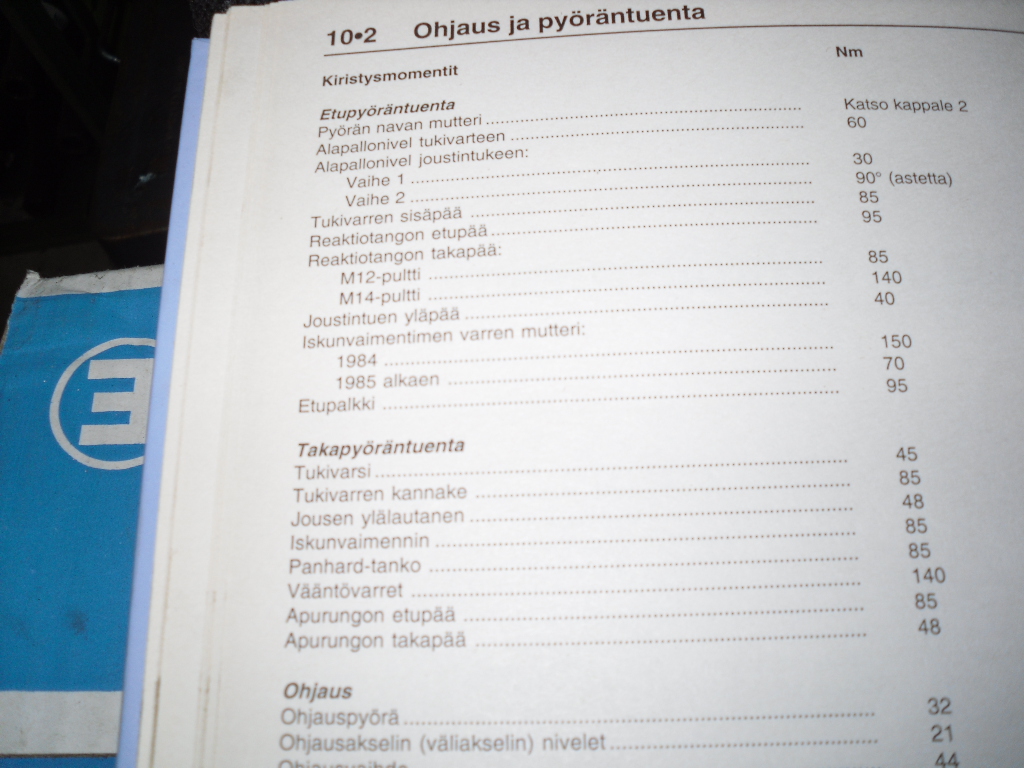 Vaihdettiin ohjaustehosimen öljyt, sen verran mitä säiliöstä sai vaihdettua (alempi säiliön letku irti tehostimen pumpusta). Downpipeä käännettiin hieman sivuun, jotta se ei osu mutkassa runkoon. Vaihdettiin kallistuksenvakaajan kumit; entiset olivat kuluneet todella väljiksi. Nyt on mukava ajella kun etupää ei kolise.