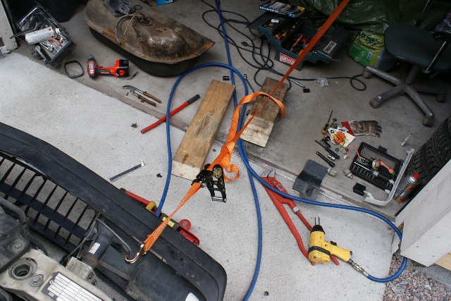 Ylimääräinen homma oli puskurin kiinnitysraudan oikaisu. Se kun oli myös antanut hieman periksi. Oikaisu tapahtui myös liinalla.