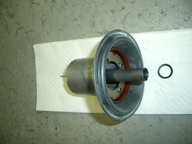 Seuraavaksi uusi kalvo paikoilleen; neljä ruuvia ja aluslevy pitävät kalvon kiinni männässä. Muista kohdistaa kalvossa olevat urat kaasuttimen koloihin, jotta mäntä tulee oikeaan asentoon kaasuttimeen nähden.