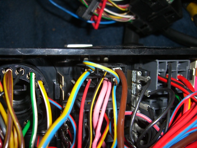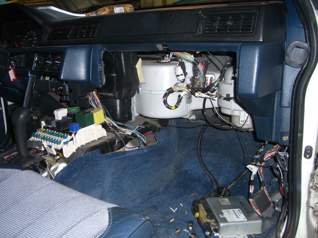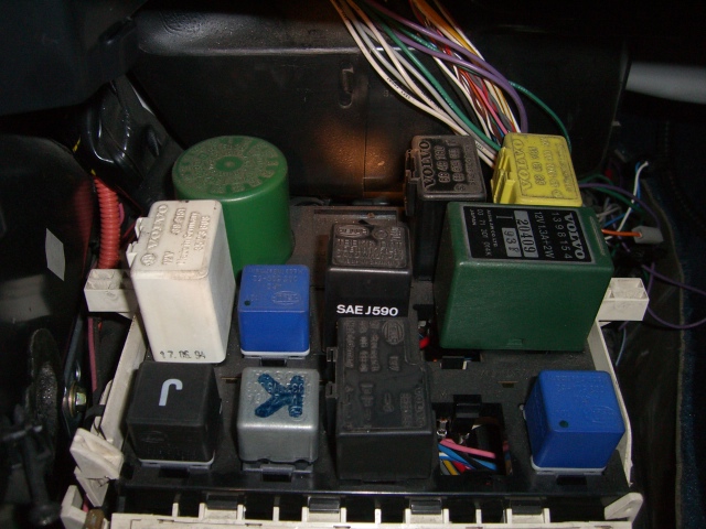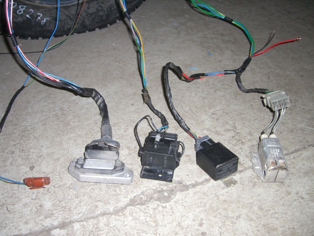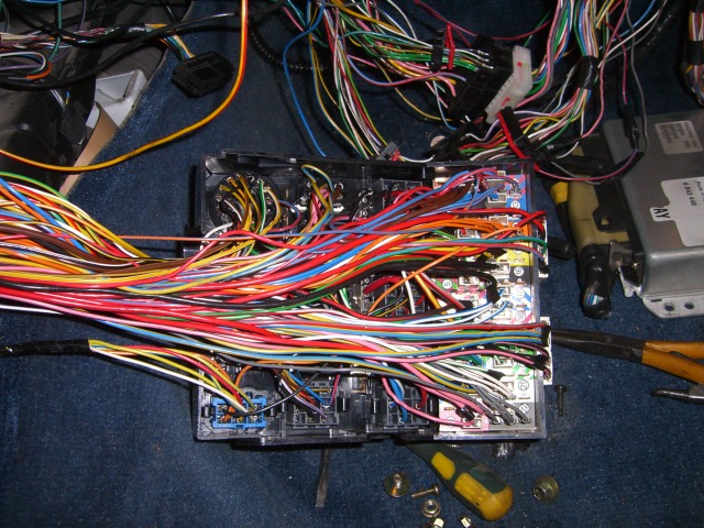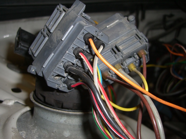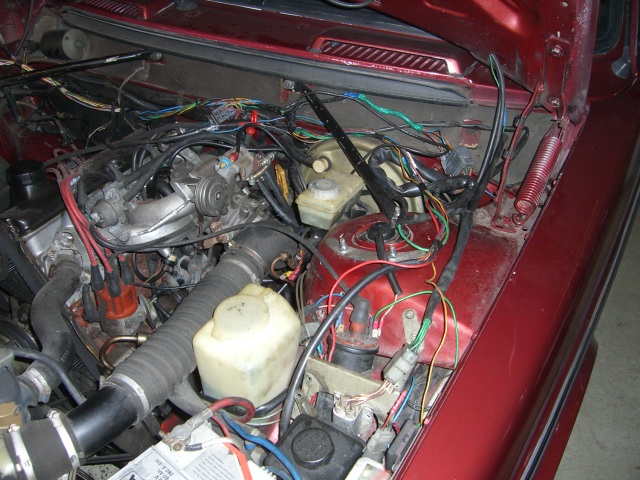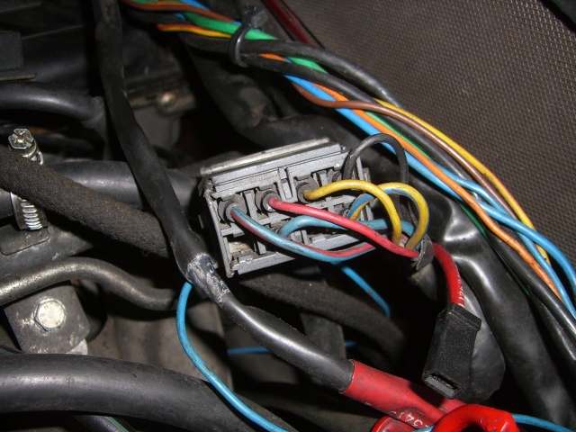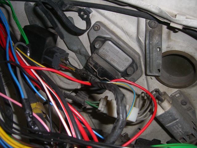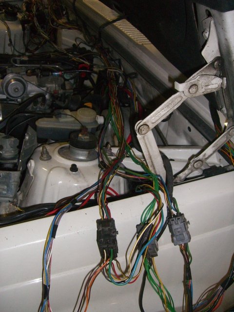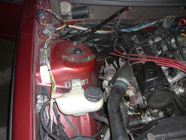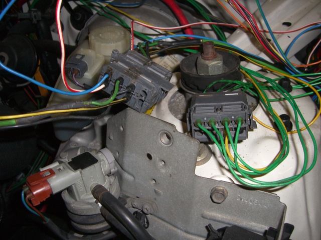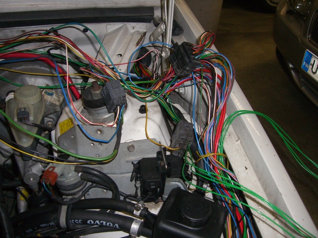 Sytkäpuoli on oikeastaan selvitetty jo kokonaan. Sytkäboksin johtosarjan saa vedettyä rintapellistä moottoritilaan. Näin ovat kaikki muut johdot esillä ja irrotettavissa paitsi sulakerasiaan menevät ruskea ja sininen sekä sisäkautta ruiskuboksille menevät kolme johtoa (ruskea-valkoinen, harmaa-punainen ja kelta-harmaa).