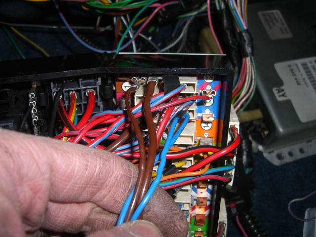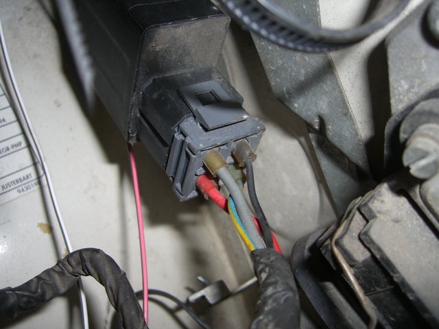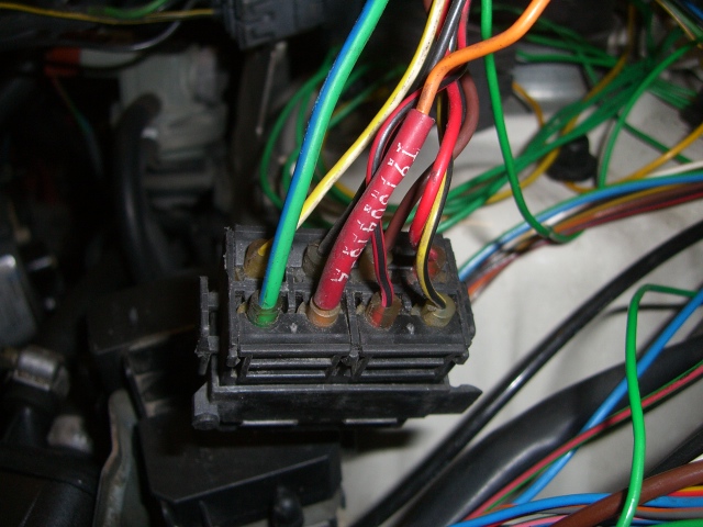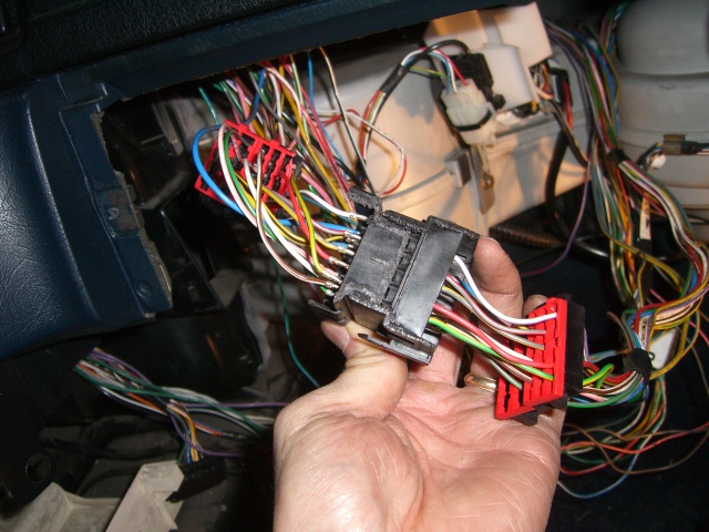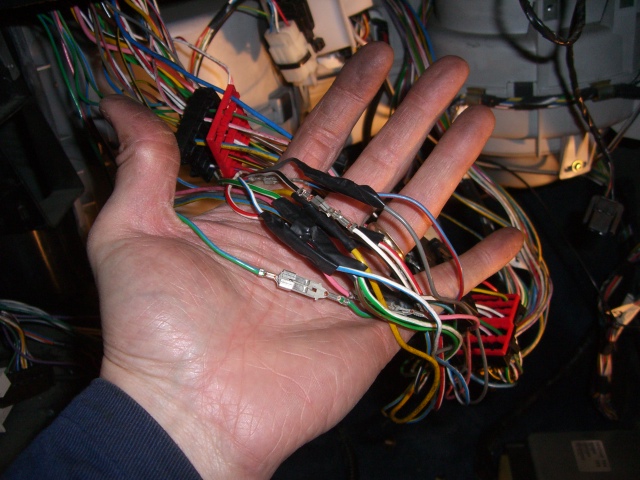 Apparin puolen liitin joka sisältää enää ruiskun johdotukset. Kädessä nippu auton omia johtoja, mitkä siitä on eroteltu. Osa näistä ruiskun johdoista meni sähkökeskukseen ja osa taas kuskin puolelle toiseen - myös auton johtosarjoja sisältävään - liittimeen, josta eroteltiin ruiskun johdot pois.