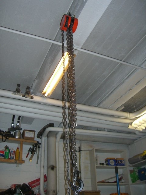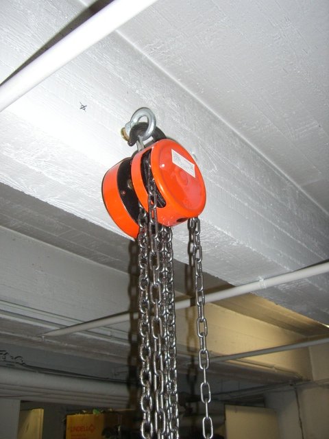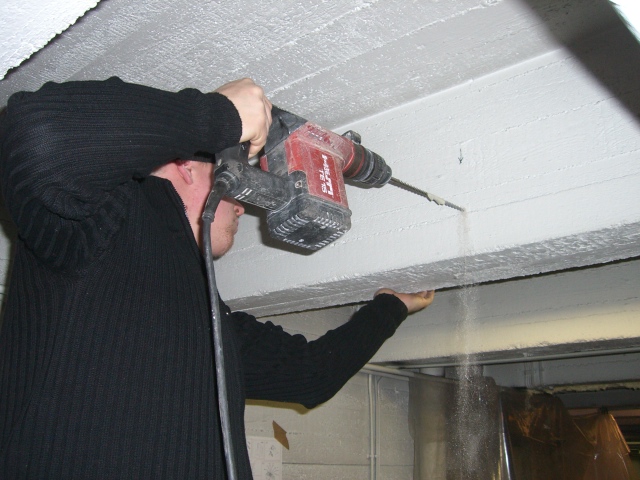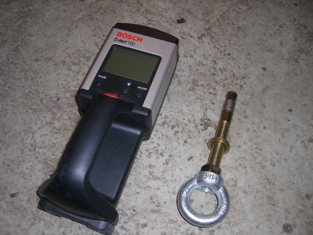 Välillä porattiin pari reikää taljalle, jotta koneet saadaan ylös autoista. Bosch D-tect mittarilla tutkittiin ensiksi raudoitukset betonin sisältä. Kiinnitystapit ja renkaat hankittiin tutusta paikasta Helsingin Ruuvikulmasta. Biltemasta ostettiin 1000 kg:n ketjutalja. Kiitokset Makkelle reikien porauksista.