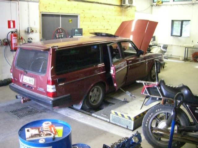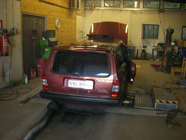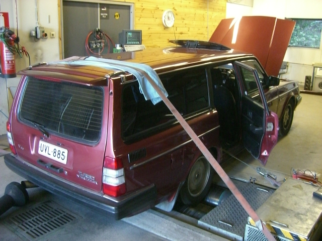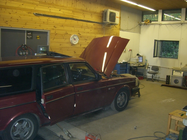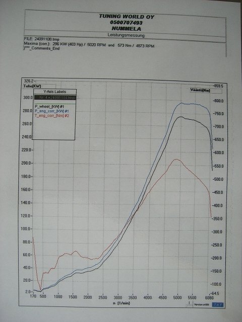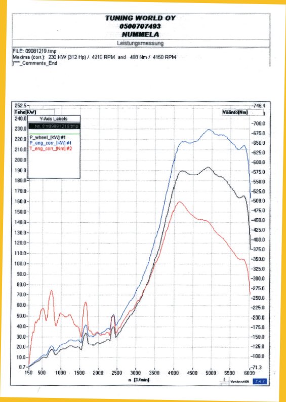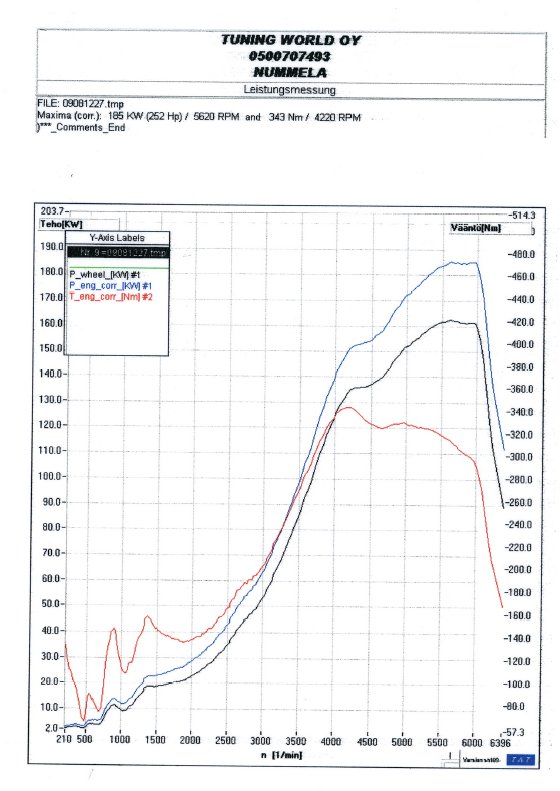 Ja sitten tehomittaus, tällä kertaa käytiin Tuning Worldissä morjenstamassa Jappe Malinia uudessa paikassa Nummelassa. Auton säädöt oli viritetty valmiiksi tappiin, bensanpainetta hieman yli 4 bar, ahtoja n. 1,4 bar mitä kone kesti vielä nakuttamatta Shellin 99+ bensalla. Omalla tolueenilla olisi saanut vieläkin lisää oktaanikestävyyttä ja ahtoja, mutta rajansa kaikella ettei kilauteta uutta "pannua" heti alkuunsa;). Oli siinä hymyssä pitelemistä kun teholukemat tulivat tietokoneen monitorin näyttöön; 230 KW eli 312 hv ja lähes 500 Nm vääntöä, 498 Nm tarkalleen. Melkoinen harppaus edelliseen 200hv/300Nm B19FT kokoonpanoon. Vakio bensanpaineilla 3 bar ja ahdoilla 0,9 bar saatiin silti hyvät 252 hv tehot ja 343 Nm väännöt. Hyvin onnistunut projekti!